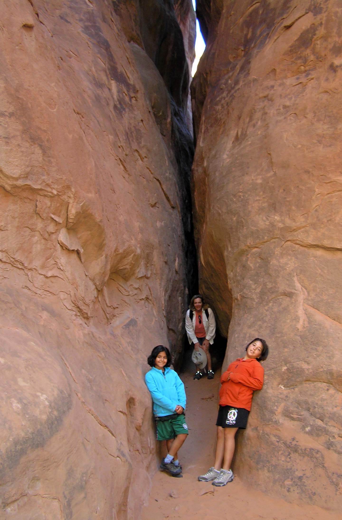 Our guide, Kenna, led our group of fourteen through the Fiery Furnace for three hours or more. We scrambled up and down rocks, squeezed through some very narrow slots (which meant crawling on hands and knees for those of us over the age of ten), and tried to figure out how to maneuver our bodies through some narrow canyons where we couldn’t touch the ground (butts on one rock face, feet on the other, scurry like a spider). We had a great time! Kenna pointed out various odd formations as well as holes we could crawl through. She also explained how the features were formed. A massive salt bed was laid down by an ancient seas; it was then covered with residue left behind by millions of years of floods, winds and more oceans. The residue compressed into a rock layer on top of the salt bed, and over time upheavals, collapses, wind and erosion led to the formations we see now.